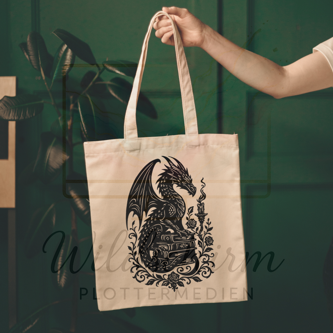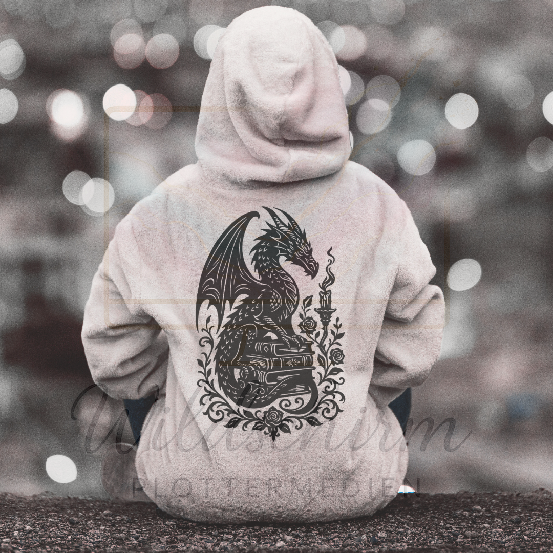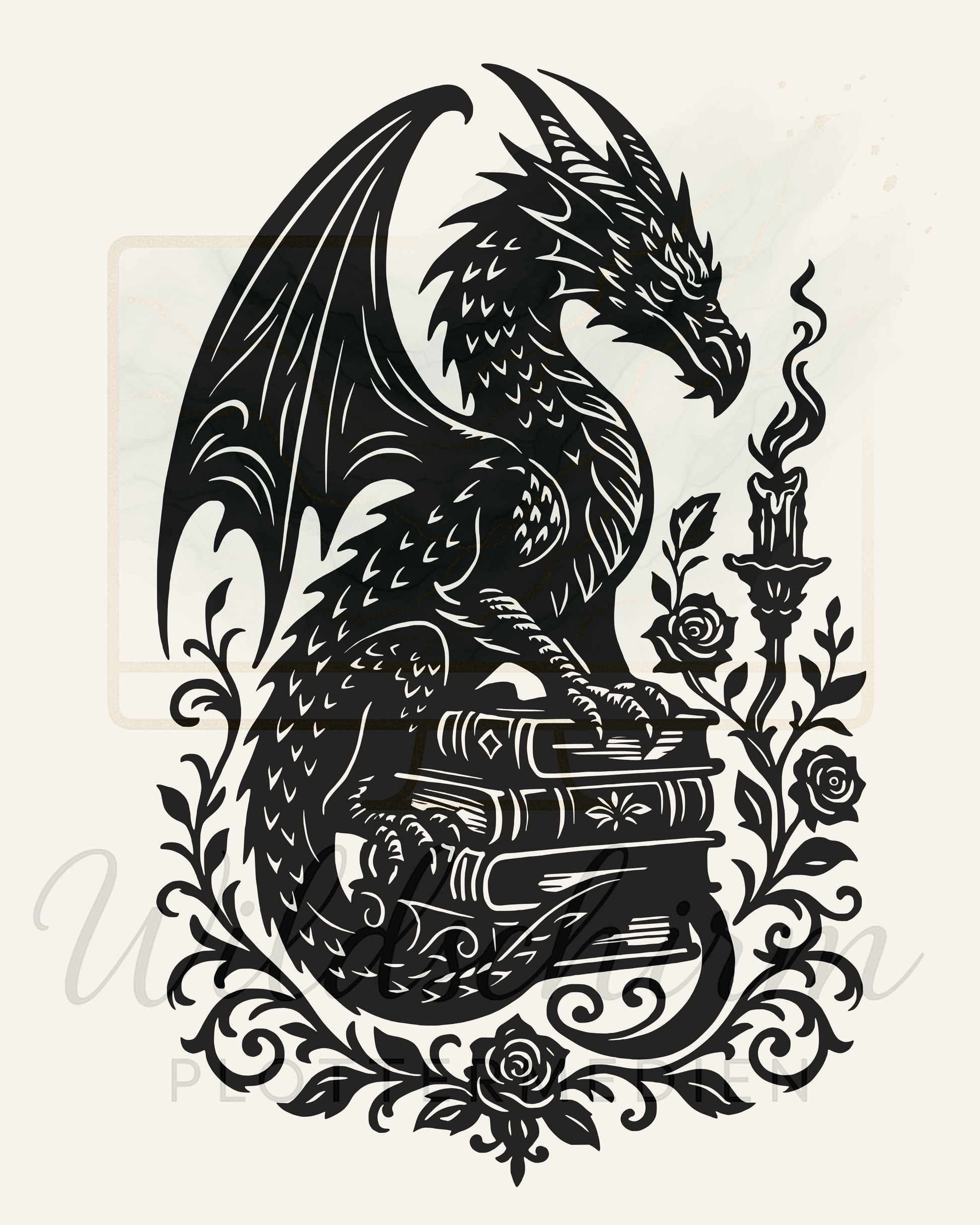 Zwischen uralten Büchern ruht der Drache, eine Flamme an seiner Seite, Rosen um ihn herum – ein Hüter des Wissens, ein Symbol für Macht und Geheimnis. Seine Schwingen sind weit, sein Blick scharf, als sei er bereit, die Geheimnisse der Nacht zu bewahren.