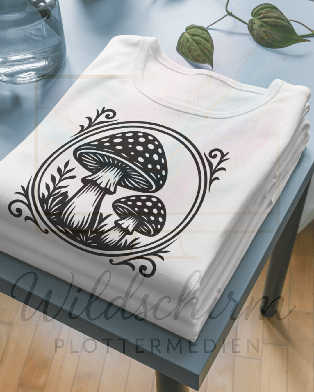 Zwei Pilze im hohen Gras, eingerahmt von feinen Ornamenten – ein Motiv, das sofort an Waldspaziergänge und den Zauber des Herbstes erinnert. Der klassische Fliegenpilz bringt ein Stück Natur, Gemütlichkeit und ein kleines Fünkchen Magie in deine Projekte.