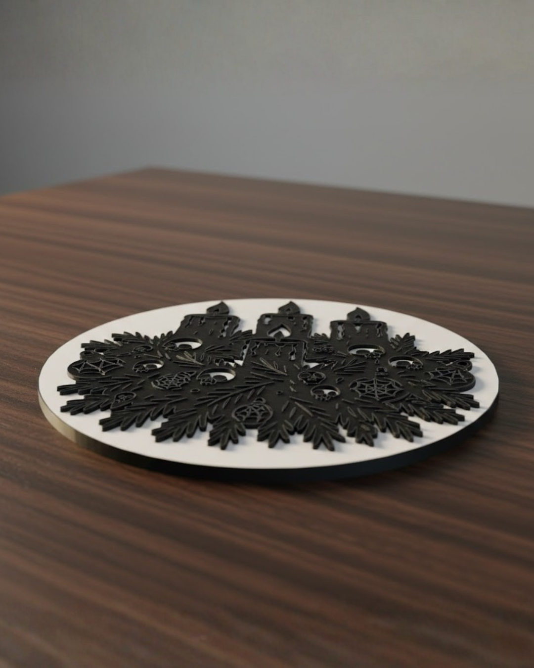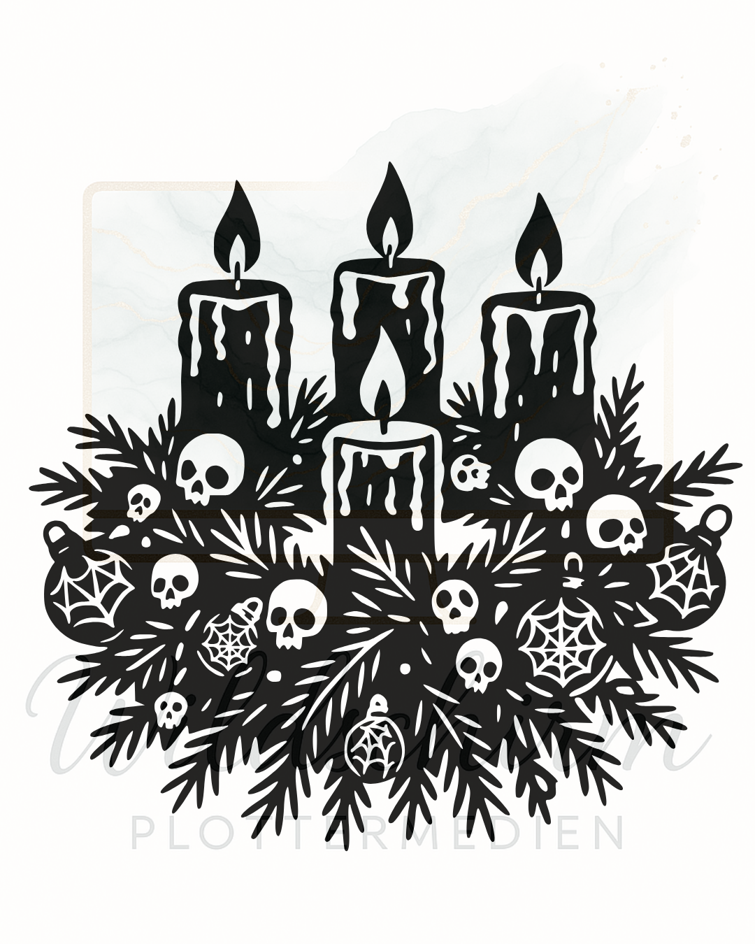 Dieses Motiv verbindet klassische Winterästhetik mit einem ruhigen, leicht düsteren Unterton. Die Tannenzweige, die feinen Schädel, die kleinen Spinnennetze und die drei brennenden Kerzen habe ich von Hand gezeichnet – als ein Motiv, das sich warm anfühlt, aber trotzdem ein wenig gegen den üblichen Weihnachtskitsch leuchtet.