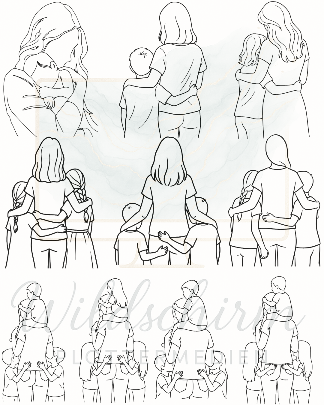 Du bekommst zehn unterschiedliche Familienkonstellationen als feine Line-Art Silhouetten – von Mama mit Baby über ein Kind bis hin zu mehreren Kindern. So kannst du für dich selbst, für Freundinnen oder für Kundinnen genau den Sweater gestalten, der eure Familie widerspiegelt.