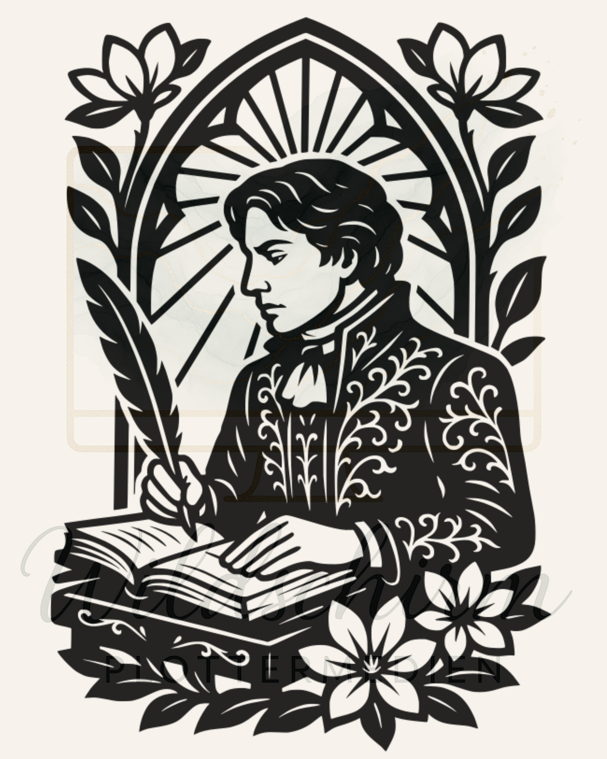 Dieses Motiv vereint Kunst, Literatur und die Ästhetik der Dark Romance – geschaffen für Plotterprojekte, Papeterie, Wandkunst oder Textilveredelungen, die den Zauber der Worte sichtbar machen.